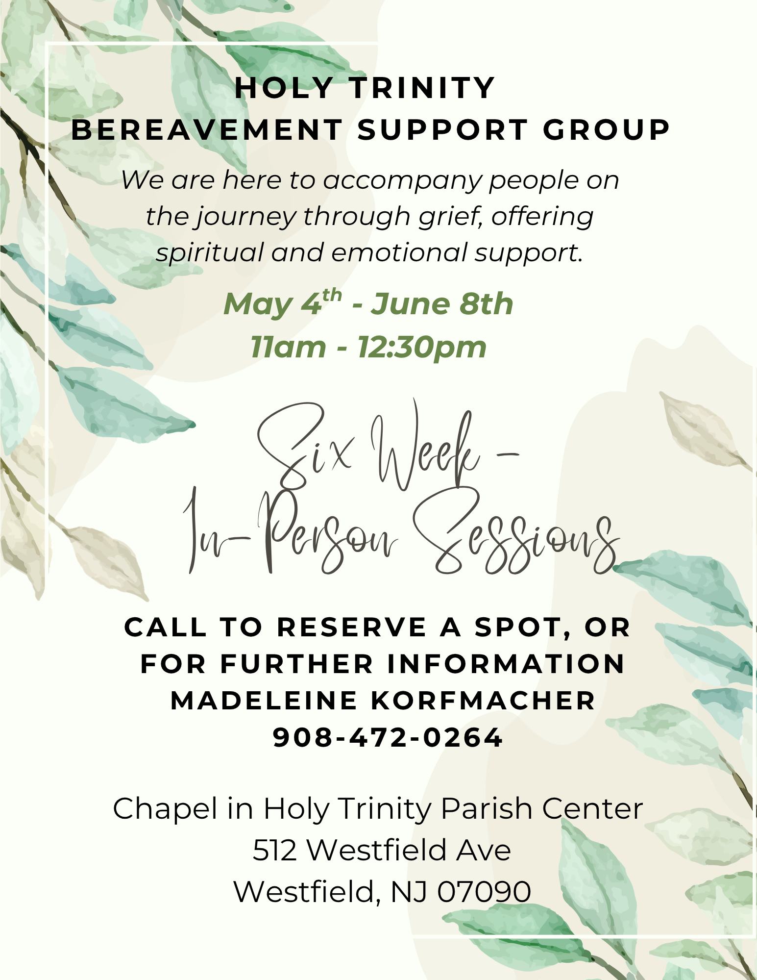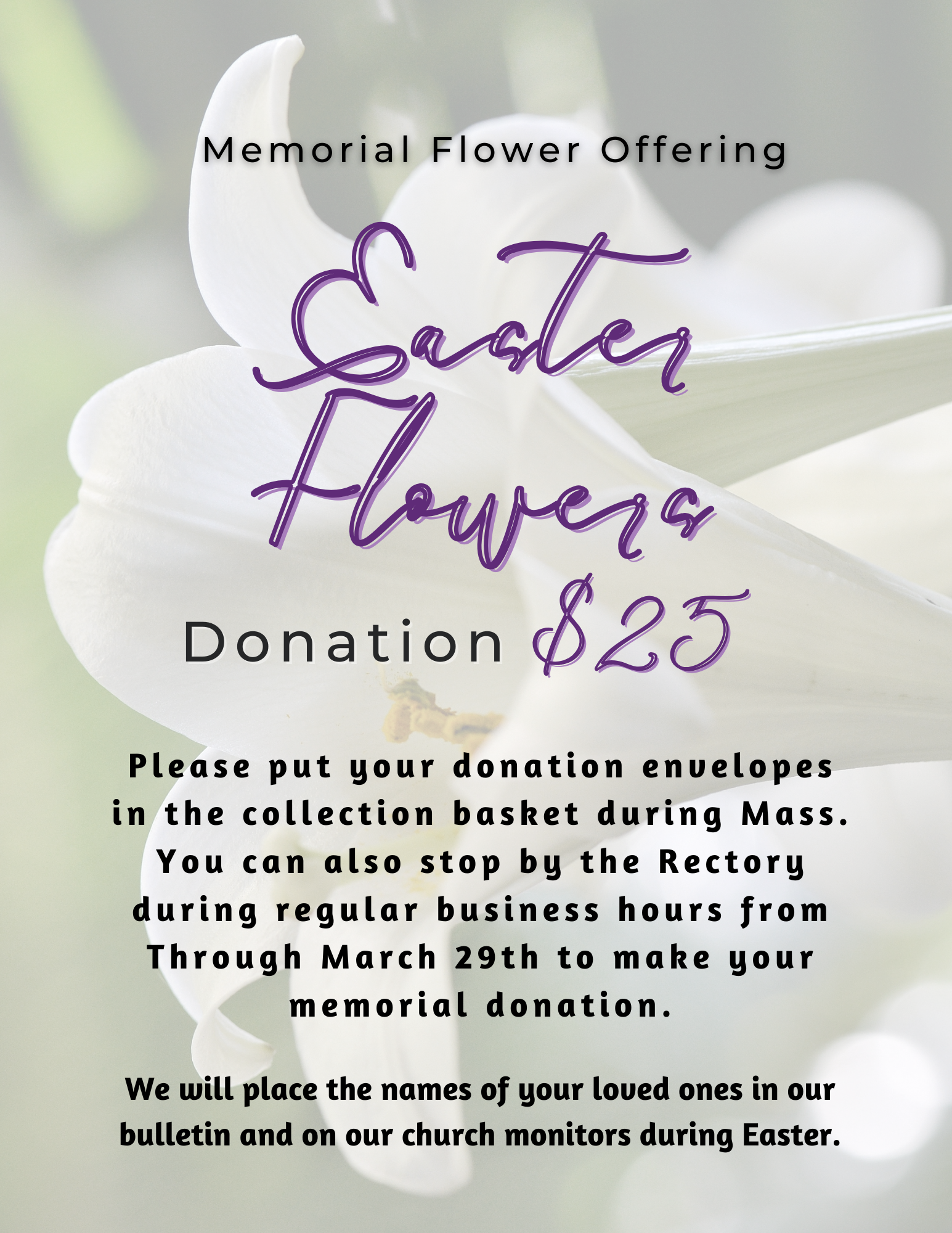 Starting 4/8/26 through 4/30/26 the Rectory will be open Monday through Thursday from 9am โ 2pmโ